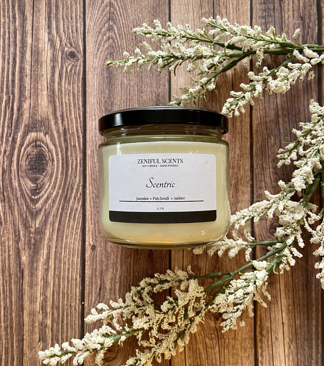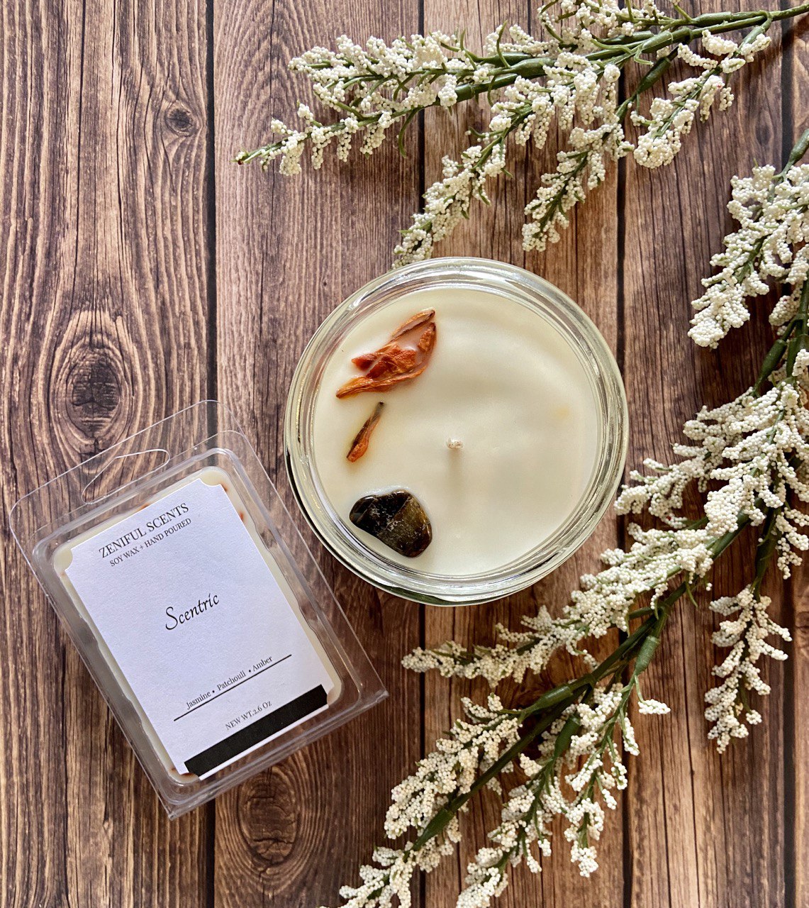 Scentric is an alluring, woody fragrance with bold musk aromas. A light touch of jasmine and ozone gives way to a heart of sandalwood, leather, and earthy patchouli. Amber and musk base notes wrap up this mysterious and complex fragrance. Candles and wax melts made with Scentric add a bit of opulence to any room.