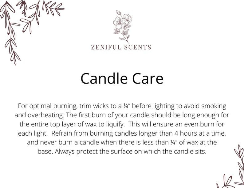 It is extremely important to follow any safety and health guidelines when burning candles. I am not exclusively liable for any inappropriate or unintended use of my candles. If harm is self-inflicted, whether accidentally or purposefully, it will be important to find adequate medical care as quickly as possible. When burning candles irresponsibly there is a risk of possible damage to your belongings and property, and harm to one’s surrounding environment, friends, family, as well as others. I bare no obligation or liability as to the possible misuse of my candles by anyone. Your purchase of this candle is your written agreement to the aforementioned announcement